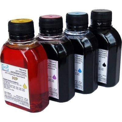 Фасовка для реализации конечному покупателю - 4 емкости по 150 гр чернил каждого цвета.
